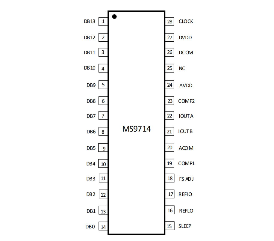 MS9708/MS9714 采用分段电流源结构和特有开关技术,以减少寄生影响和提高动态转换性能。该芯片将边沿触发锁存器和温度补偿带隙基准集成在一起,从而得到一个完整的单片集成电路 DAC 解决方案。电流满刻度输出为 20mA,输出阻抗大于 100kΩ。