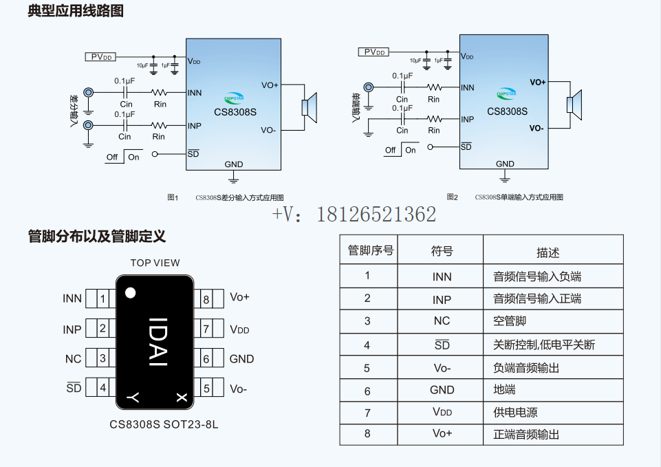 CS8308S是一款高效率,超低EMI,3.1W单声道D类音频放大器。CS8308S无需滤波器的PWM调制结构减少了外部元件、PCB面积和系统成本,而且也简化了设计。高达90%的效率,快速的启动时间和纤小的封装尺寸使得CS8308S成为小型手上设备的最佳选择。