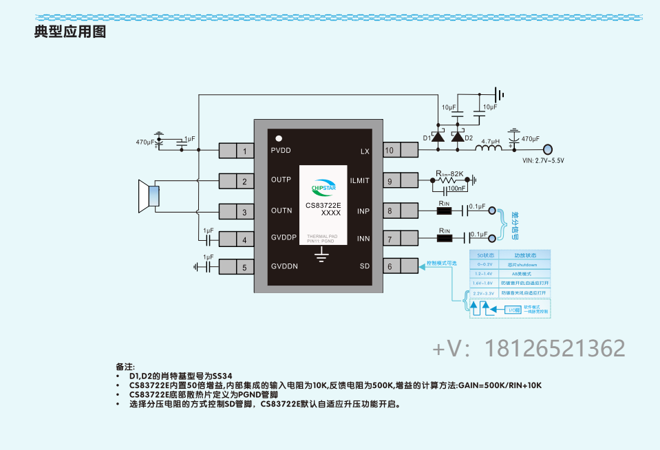 CS83722E是一款内置BOOST升压模块带防破音功能R类音频功率放大器。可以为3Ω的负载提供最高17W的恒定功率.AB类D类可切换模式的设计,最大限度的减少音频子系统中功放对FM的干扰,CS83722E在锂电池的供电电压范围内提供了极致的功率输出,使得CS83722E成为便携式音箱设备特别是扩音器产品的最优选择.