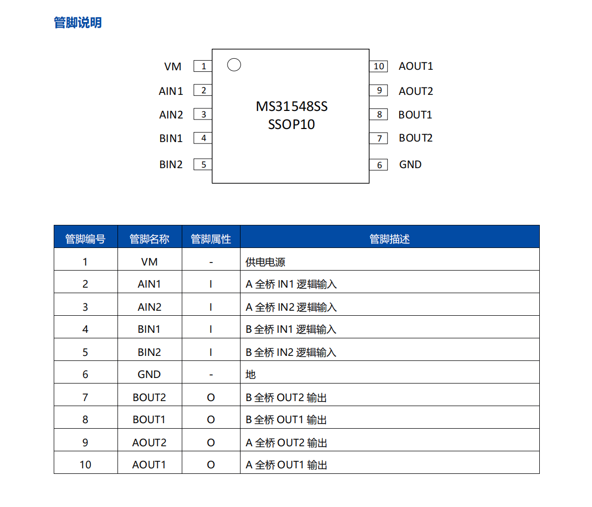 MS31548 是一个双全桥电机驱动。电源电压供电范围 4V 到 15V,平均电流 0.9A,电流峰值1.3A。如果需要更高的电流能力,可以将双全桥并联使用。可Pin to Pin兼容GC8548。