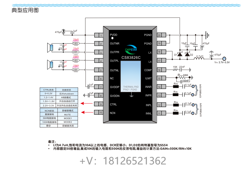 CS83826C的全差分架构和极高的PSRR有效地提高对RF噪声的抑制能力。无需滤波器的PWM调制结构及内置的BOOST升压模块,以及CS83826C采用专有的AERC((Adaptive Edge Rate Control)技术,在音频全带宽范围内极大地降低了EMI的干扰,另外CS83826C内置了过流保护,短路保护和过热保护,有效的保护芯片在异常的工作条件下不被损坏。