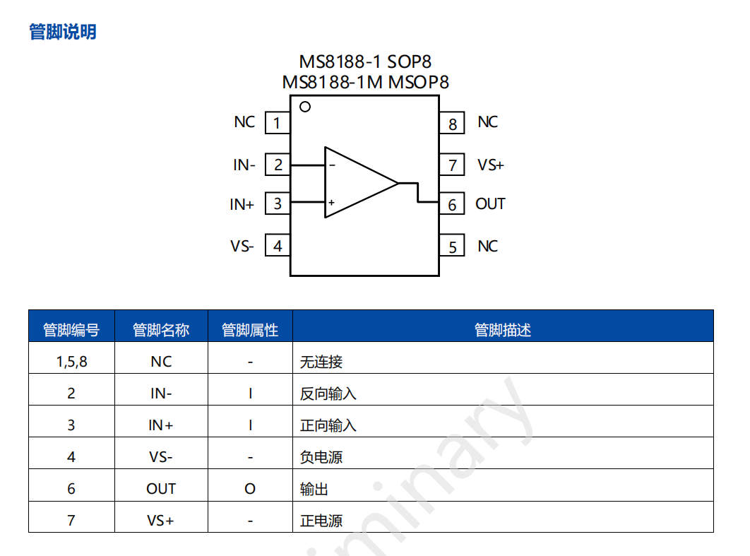 MS8188是一款36V高精度低噪声的运算放大器。可兼容OPA188/ADA4522/MAX44244//MAX44245/MAX44248/TPA1831/TPA1832/TPA1834。采用高压斩波技术来实现零温漂的特性。与同类产品相比,斩波频率谐波上的毛刺大幅度减小。出色的DC精度还包括高电源抑制比、高共模抑制比和高开环增益。输入共模电压范围包括负电源轨,输出电压范围为轨到轨。