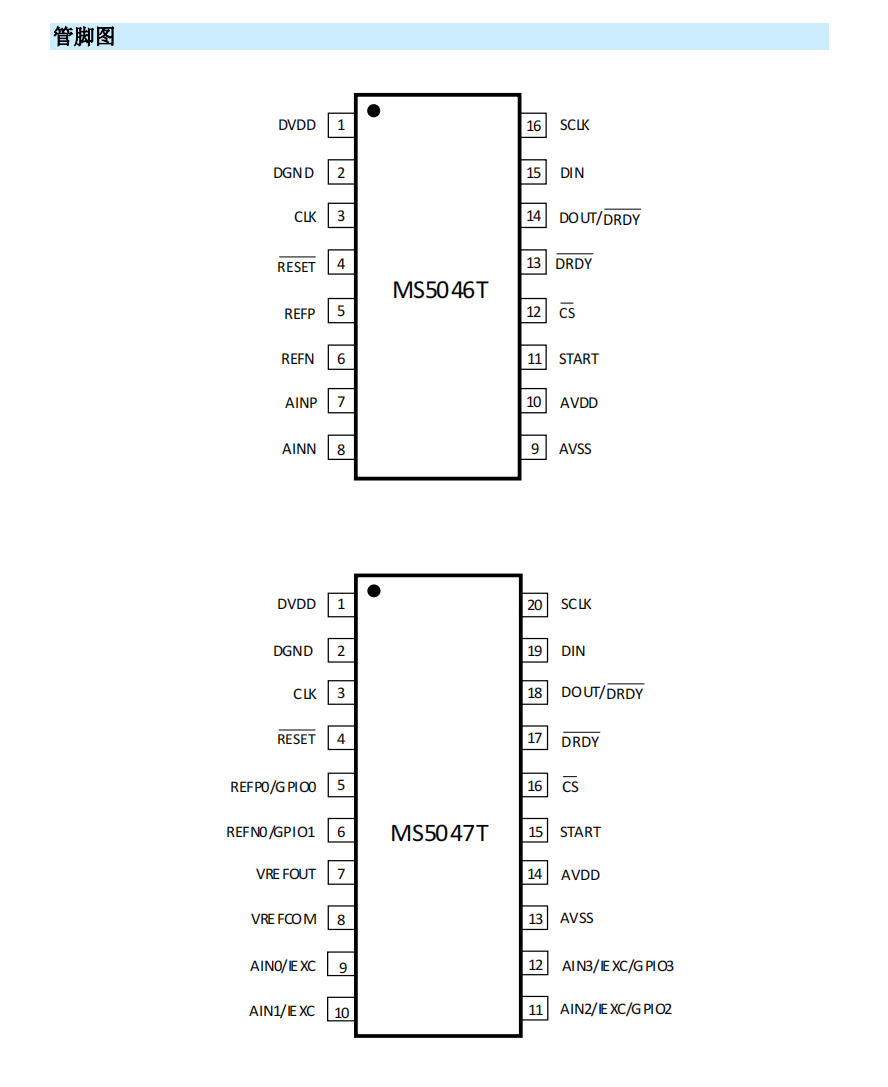 MS5046T/MS5047T/MS5048T/MS5048N 是适合高精度、低成本测量应用的 16bit 模数转换器。其内部集成低噪声可编程增益放大器、高精度 Δ-Σ 模数转换器和内部振荡器。MS5047T、MS5048T、MS5048N 内部还集成低温漂基准和两路匹配的可编程电流源。MS5048T/MS5048N 支持四路差分输入,MS5047T 支持两路差分输入,MS5046T 支持单路差分输入。此外,MS504XT 系列芯片还集成传感器检测 Burnout 电流源和偏置电压产生器。可Pin to Pin兼容ADS1146。