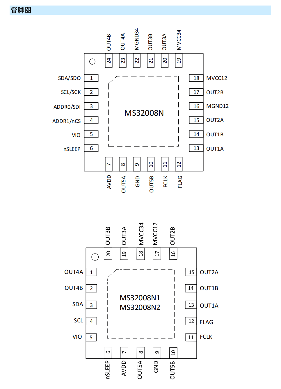 MS32008N/MS32008N1/MS32008N2 是一款多通道电机驱动芯片,其中包含两路步进电机驱动,一路直流电机驱动;每个步进电机驱动通道的最大工作电流 1.0A;支持两相四线与四相五线步进电机。